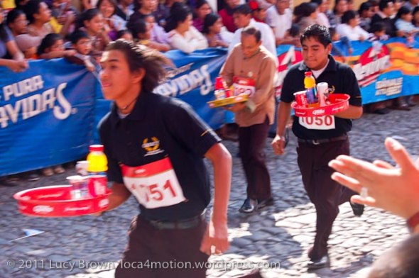 Waiters, waitresses and bartenders raced about two kilometers along the uneven, cobble-stoned streets, each carrying a tray laden with bottled and canned drinks, the winner reaching the finish line without toppling or losing the tray’s contents.