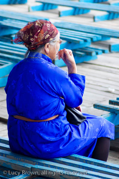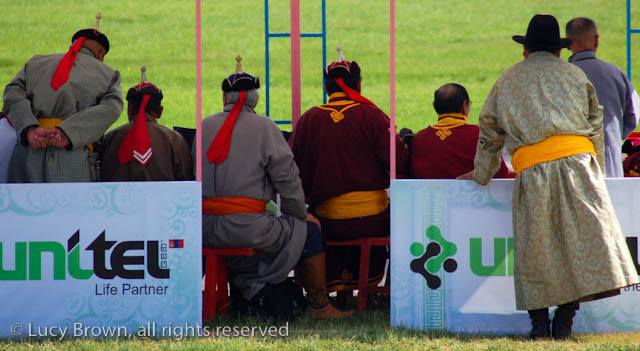 Officials in the stadium dressed in the national costume. This robe-like garment called a deel is daily wear for many people in the city and out on the steppe.