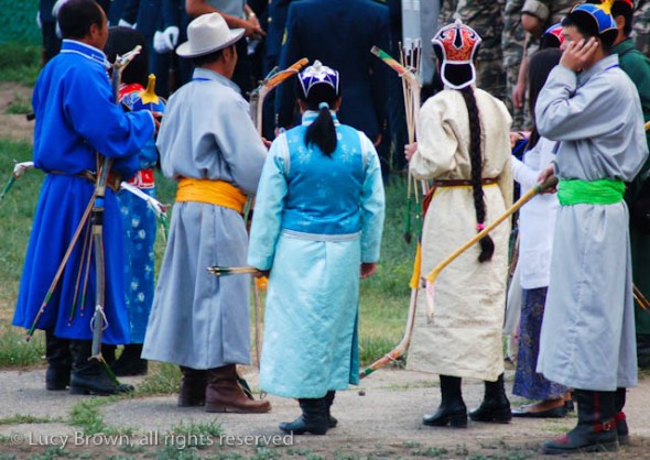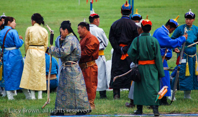 Archery display. Both men and women compete in Mongolian archery and wear traditional costumes.