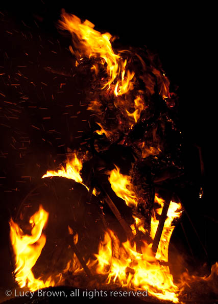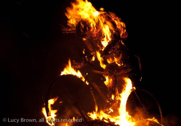 A crescendo of firecrackers deafen and threaten the crowds before the bomberos put out the glowing embers around the bicycle skeleton and everyone wanders away in festive spirit.