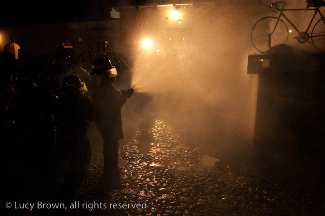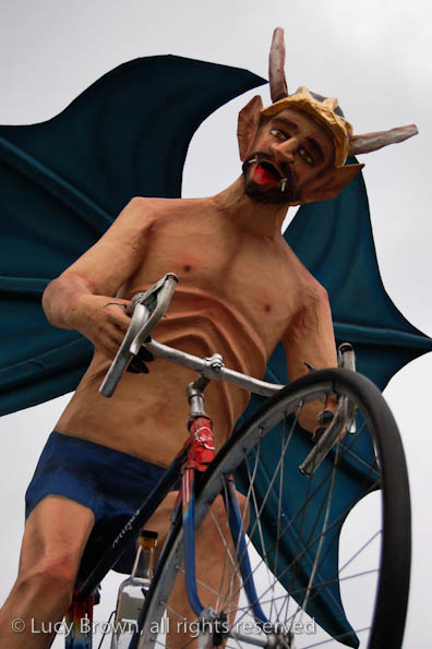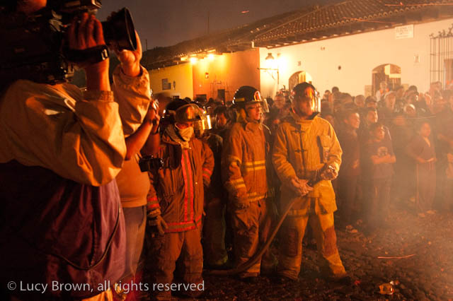 A crescendo of firecrackers deafen and threaten the crowds before the bomberos put out the glowing embers around the bicycle skeleton and everyone wanders away in festive spirit.