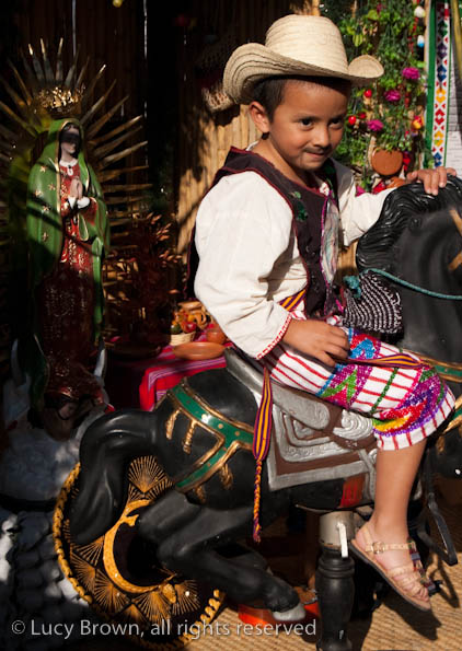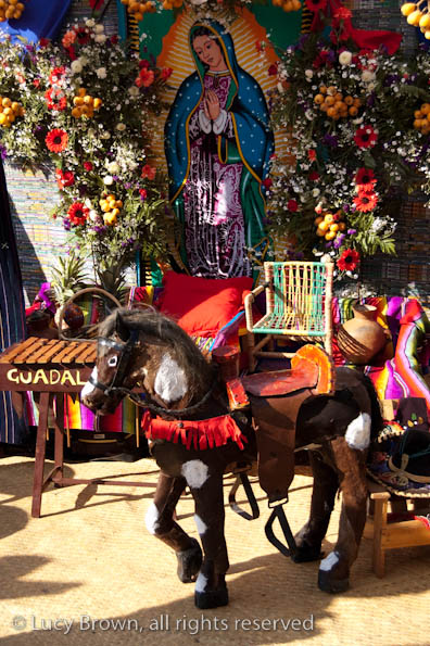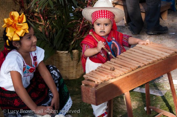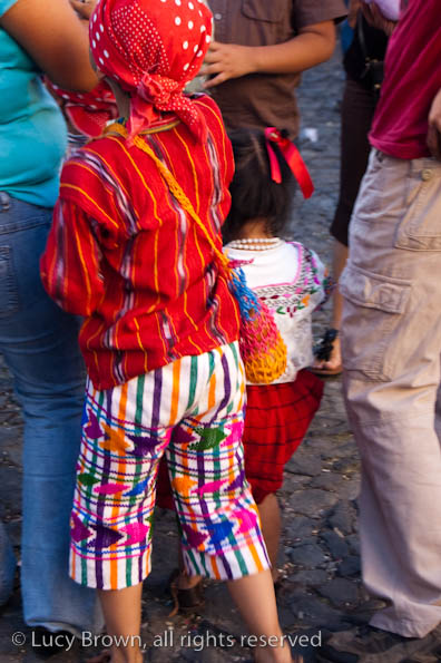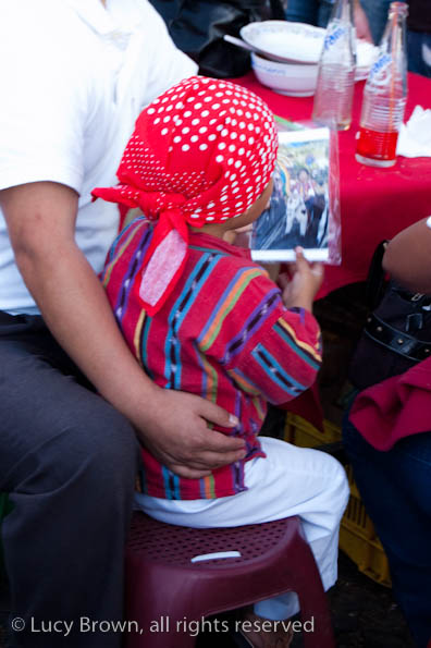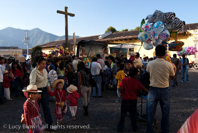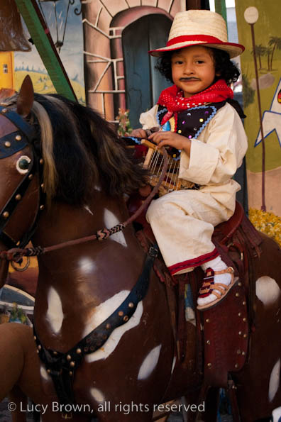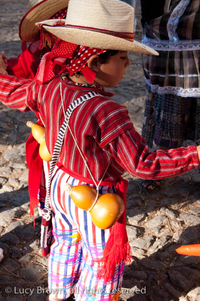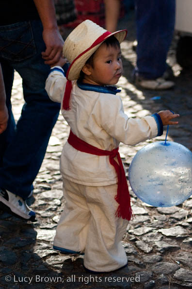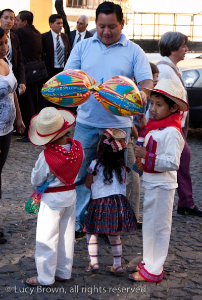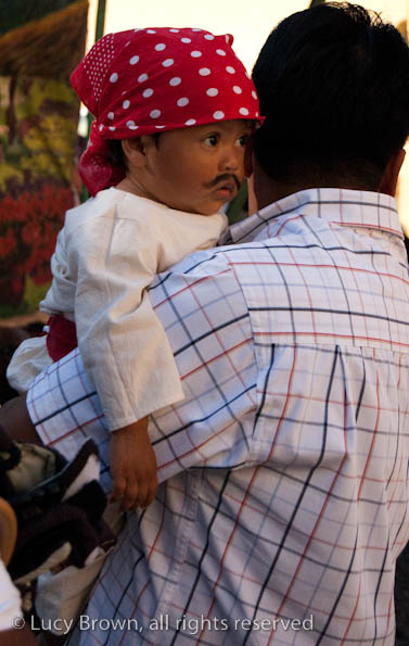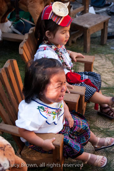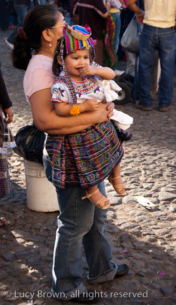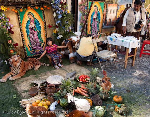 In Antigua the celebrations take place in front of the beautiful baroque church of La Merced. Rustic mini-scenes backed by painted images of the Virgin are set up in front of the church and parents pose their children for photographers. Tiny replicas of adults, the boys have mustaches painted on their faces and the girls little baskets tied to their heads. Each scene has a variety of typical Guatemalan everyday items for the children to use as props including miniature marimba, tortillas on a comal, model horses and a strange collection of live chickens and toy tigers.
