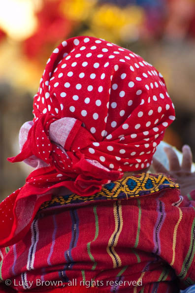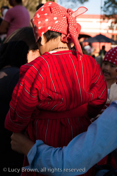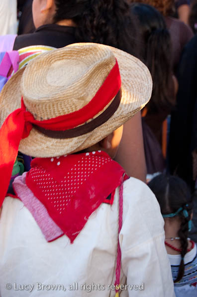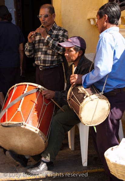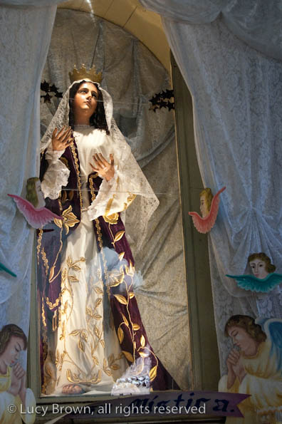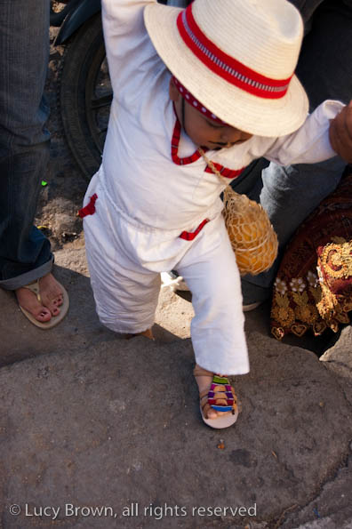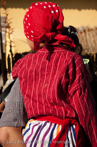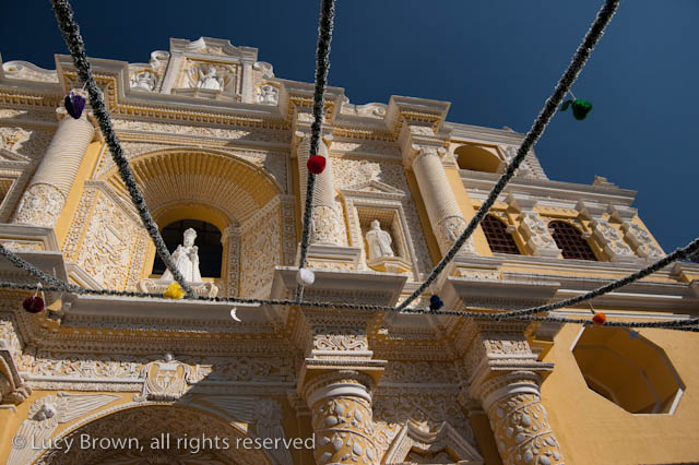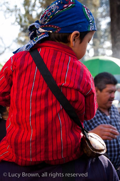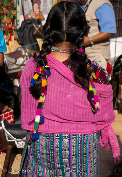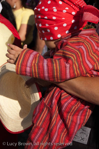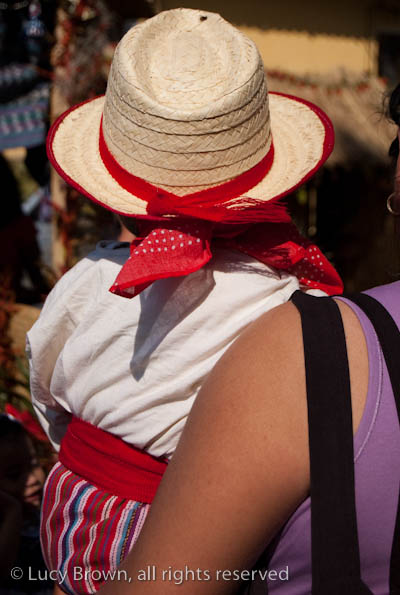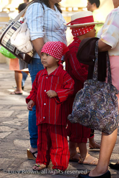 In Antigua the celebrations take place in front of the beautiful baroque church of La Merced. Rustic mini-scenes backed by painted images of the Virgin are set up in front of the church and parents pose their children for photographers. Tiny replicas of adults, the boys have mustaches painted on their faces and the girls little baskets tied to their heads. Each scene has a variety of typical Guatemalan everyday items for the children to use as props including miniature marimba, tortillas on a comal, model horses and a strange collection of live chickens and toy tigers.