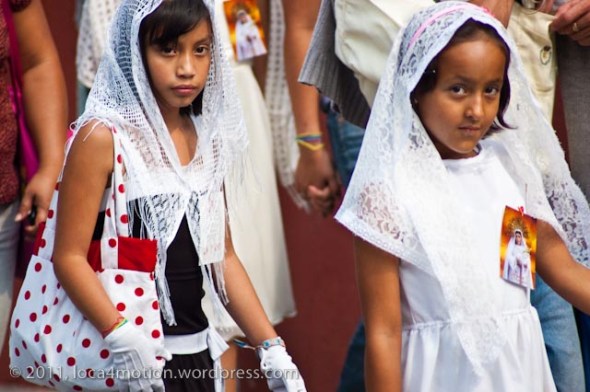 Mothers dress up their young daughters in formal black and white, often covering their heads in lace shawls, and either carry or lead them while they take part in processions.