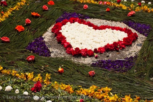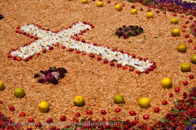 This post is dedicated to details of these pieces of art made of dyed sawdust, pine needles, flowers, fruit and vegetables where biblical and Mayan themes, crosses and hearts predominate.