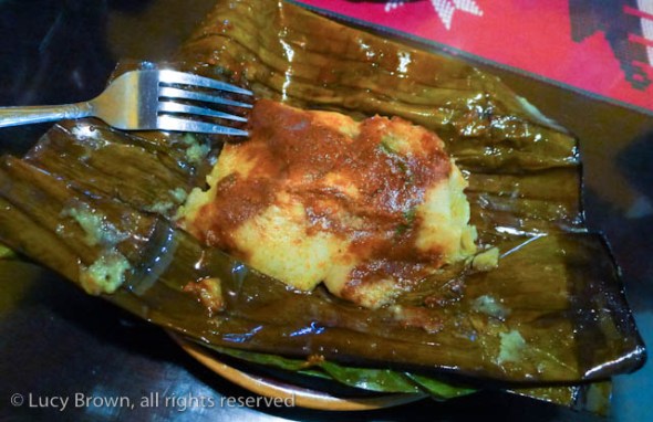 Made from a cooked maize dough or masa with a tomato-based sauce and a piece of pork, chicken or turkey inside, it is served wrapped up in banana leaves.