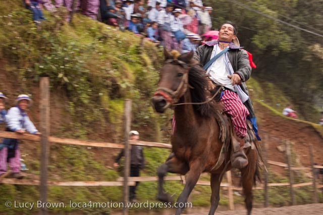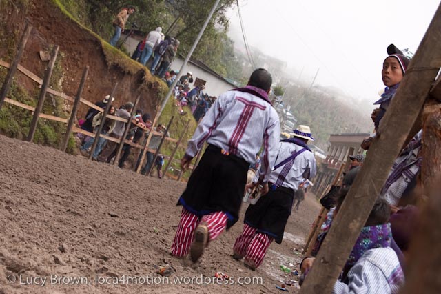 Spectators are mainly colorfully clad locals from Todos Santos and surrounding settlements with a handful of outsiders. Crowding against the wooden railings or scrambling up a steep grassy incline for a birds-eye view, neither cheering nor clapping, each village’s distinctive costume clashes against its neighbor.