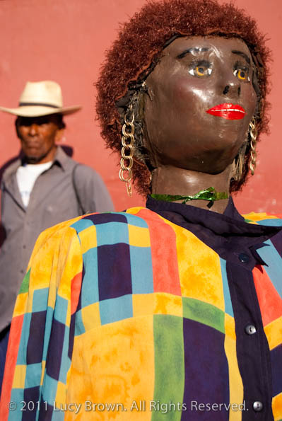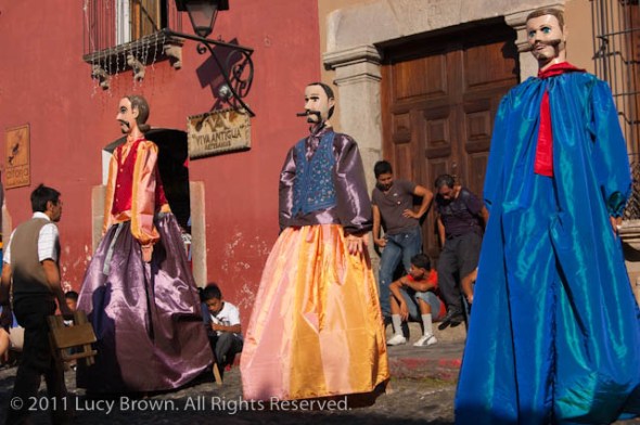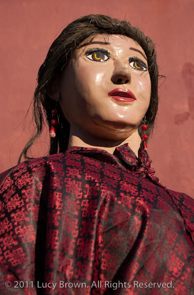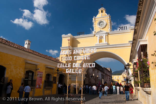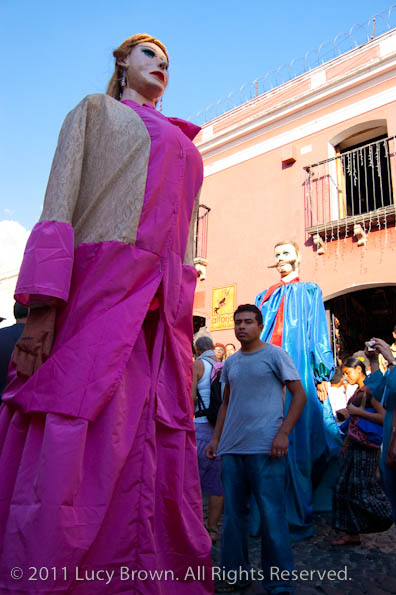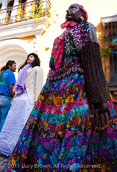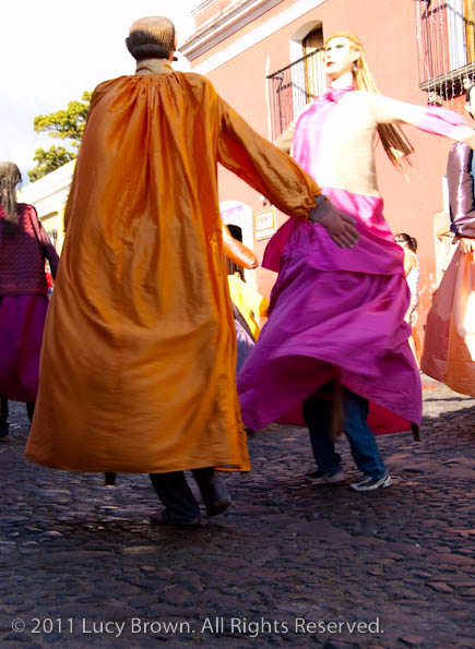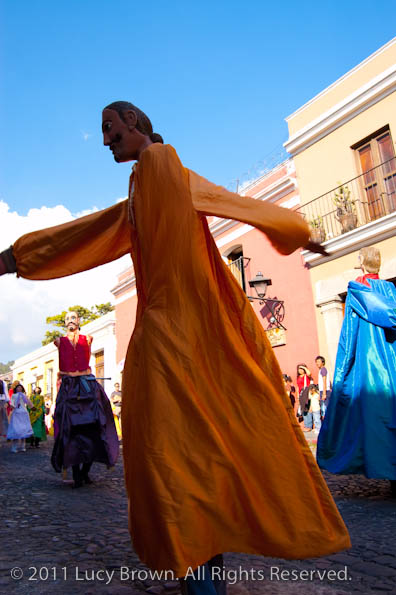 On the 31st of December in the 5a Avenida Norte, the street with the landmark arch in Antigua, against the colonial backdrop of crumbling ruins and color splashed walls of soft hued reds, blues and yellows, gigantes welcome in the New Year festivities.