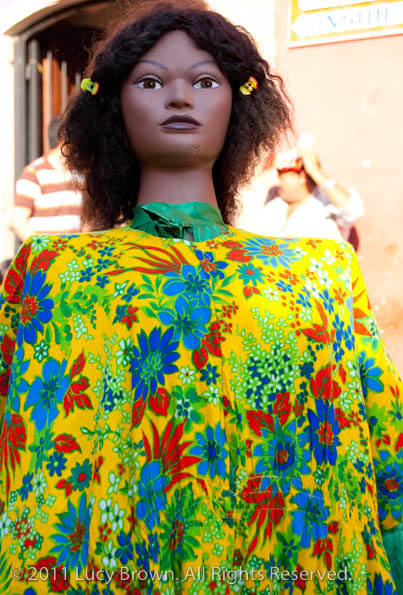 Inside these towering jumbo manikins, tucked away under the folds of cloth with tiny feet poking from below, a mortal stomps and sways and twirls its skirts to the rhythm of the music.