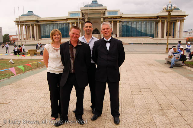 Going to meet Chinggis Khaan. They rope off the area in front of Government house and only Mike, Anna and the photographer climbed the steps.