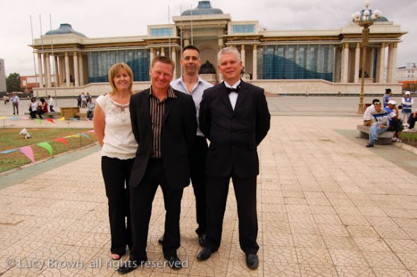 English friends Kerry, Mark and Andy and my older brother Matt with Chinggis Khaan peering out between their heads.