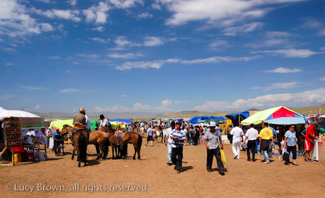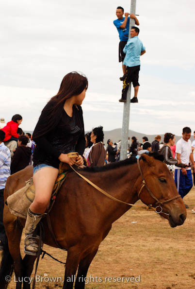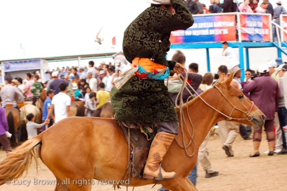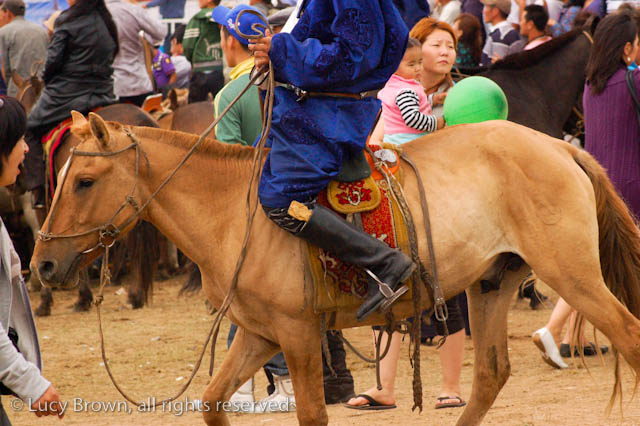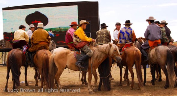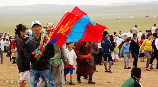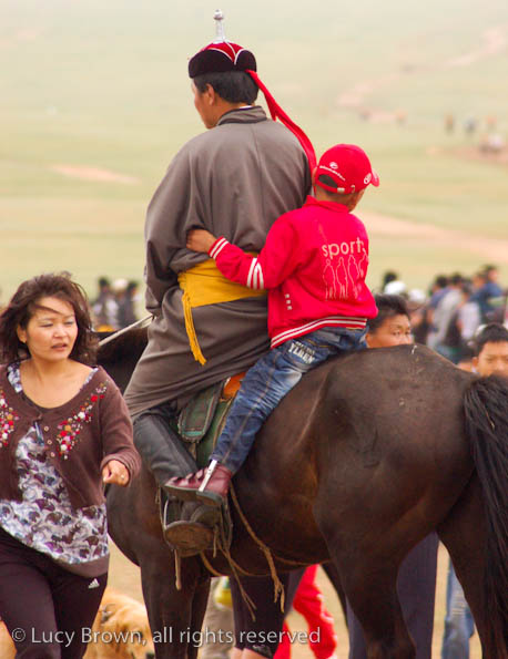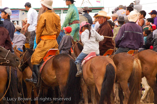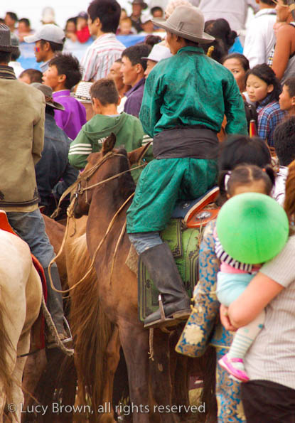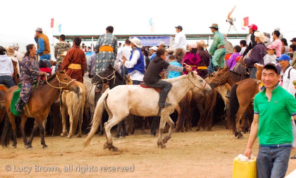We cut back across the steppe partly on dirt tracks and the rest of the time off-road. Finally we reached our journey’s end, the race finish line, which was a flurry of activity with droves of people walking or riding around on horseback, many in traditional Mongolian costumes. There was an excited buzz in the air as they waited for the race finale.