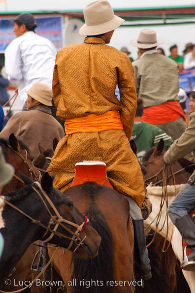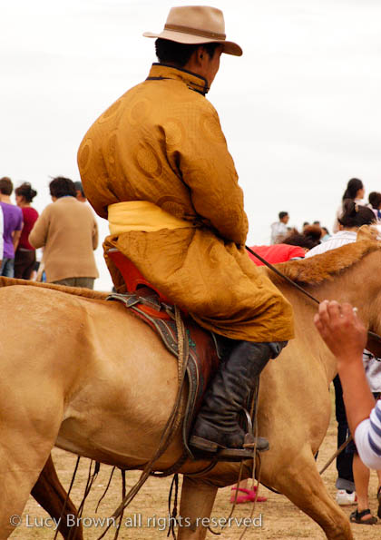 Horseman wearing a brightly colored deel, the national costume. This robe-like garment is daily wear for many Mongolians. Here there was a real mix of traditional Mongolian and western style clothing.